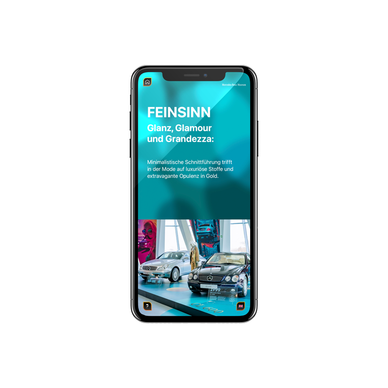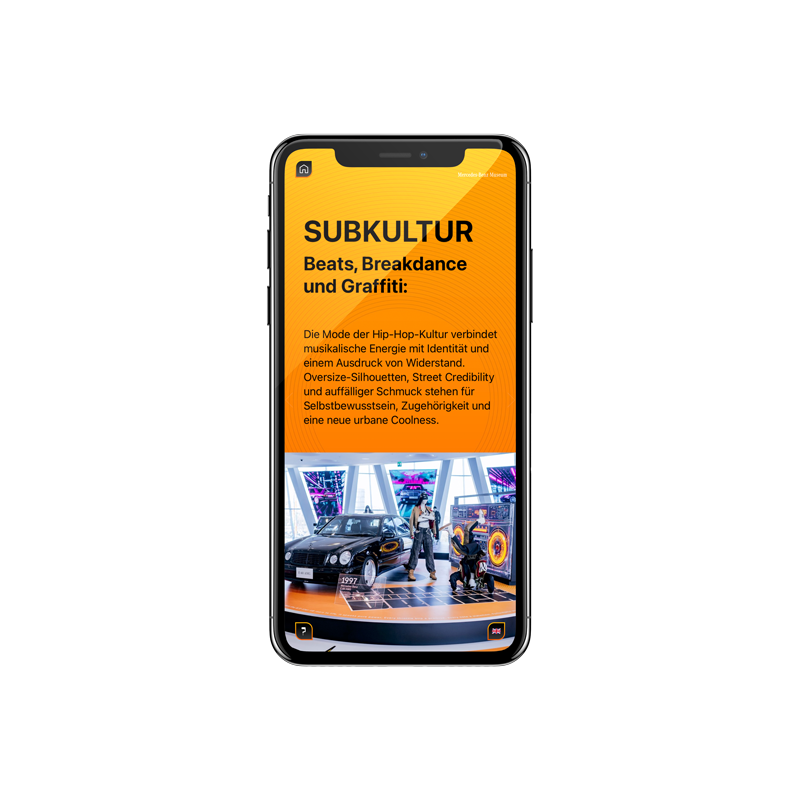 Die grafische Gestaltung umfasst Print für Vitrinen, Podeste und Wandgrafiken, Screen/UI-Design für vier interaktive Stationen, Animationen sowie die Erstellung und Programmierung einer eigenen Fashion-App.