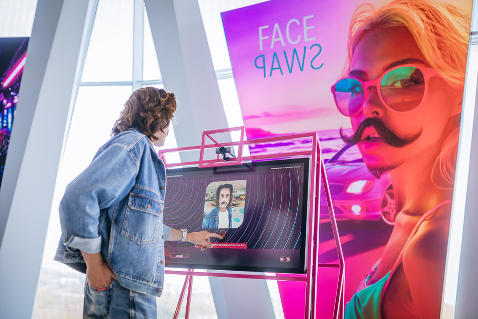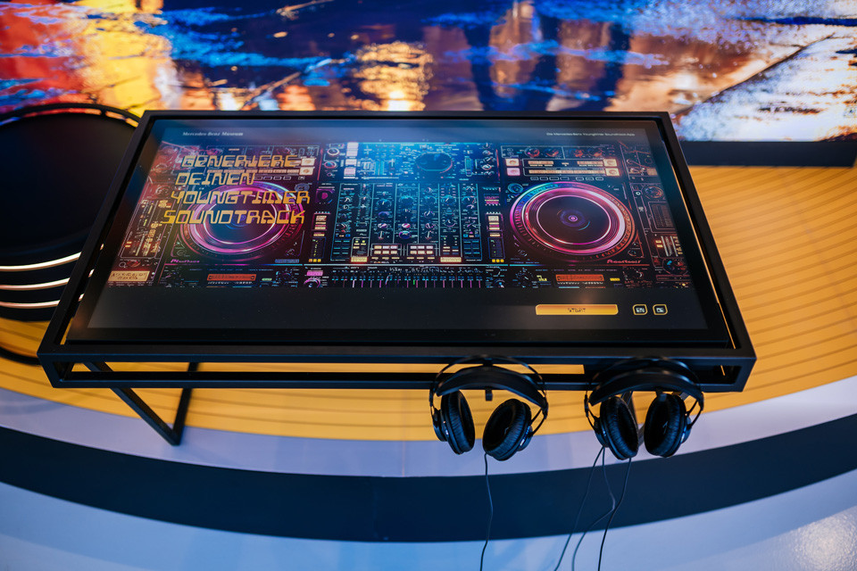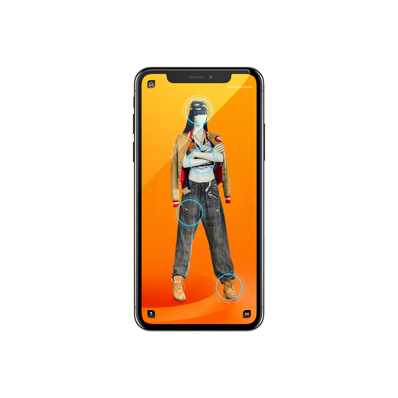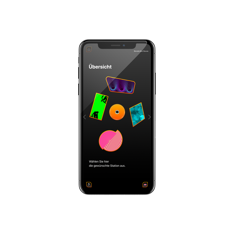 Idle-Screen für das vor Ort spielbare Racing-Game EVO Racer 2000 und Beispiel-Screens der Fashion-App, die detailierte Informationen zu den ausgestellten Modefiguren bereit stellt.